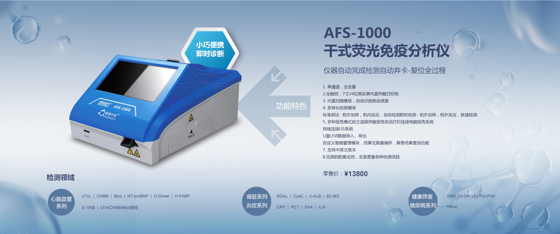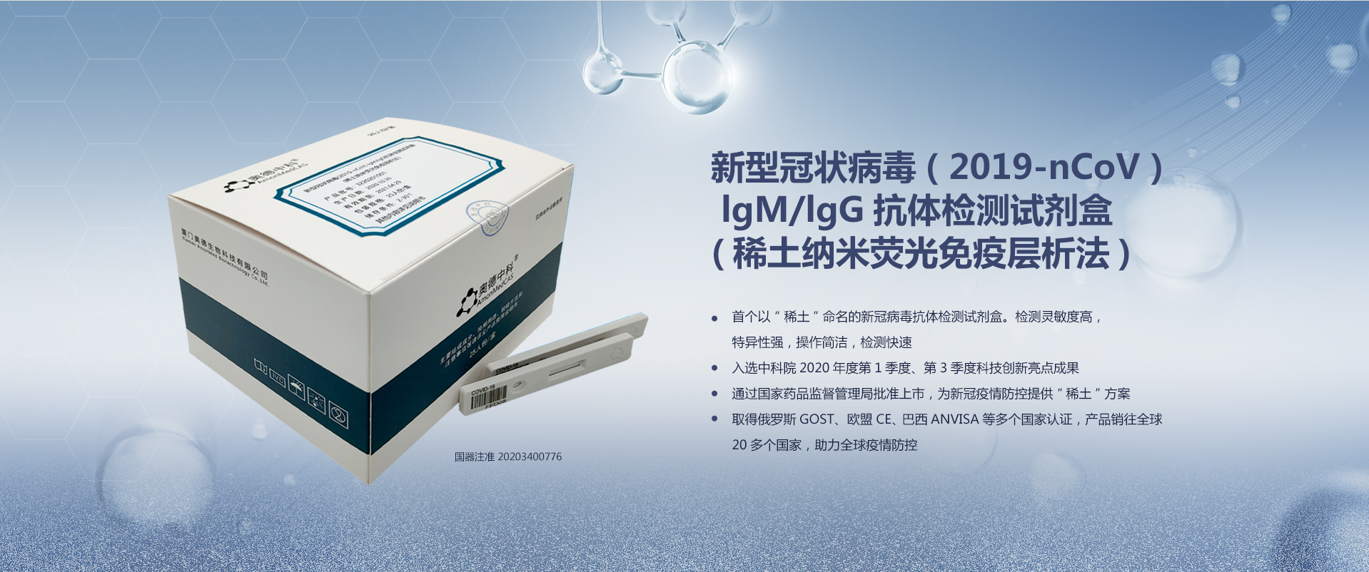 作為中國(guó)稀土生物醫(yī)學(xué)企業(yè)的開(kāi)拓者,公司擁有雄厚的科研實(shí)力,先后承擔(dān)完成多項(xiàng)國(guó)家、省市課題。目前擁有13項(xiàng)稀土生物醫(yī)學(xué)領(lǐng)域的專(zhuān)利,并成功開(kāi)發(fā)出一系列全球獨(dú)家且具有自主知識(shí)產(chǎn)權(quán)的稀土納米熒光免疫體外診斷產(chǎn)品,其中35項(xiàng)產(chǎn)品通過(guò)歐盟CE認(rèn)證,25項(xiàng)體外診斷試劑及2項(xiàng)稀土納米熒光免疫分析儀獲得國(guó)家醫(yī)療器械注冊(cè)證,包括新冠病毒檢測(cè)、心肌三聯(lián)檢、C-反應(yīng)蛋白檢測(cè)、D-二聚體檢測(cè)等試劑產(chǎn)品。