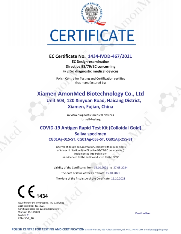 2021年10月15號(hào),波蘭PCBC機(jī)構(gòu)國際公告(公告號(hào)1434),正式頒布奧德生物新型冠狀病毒抗原快速檢測試劑盒 (膠體金法)唾液拭子歐盟自測CE認(rèn)證證書。奧德CE證書是按照歐盟8月份頒布的新法規(guī)準(zhǔn)備的技術(shù)文件。